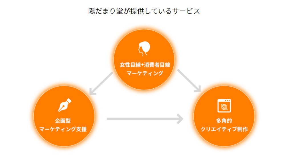 陽だまり堂は、“女性目線マーケティング” “企画型マーケティング支援” “多角的クリエイティブ制作”の三つを柱に企業支援を行っています。